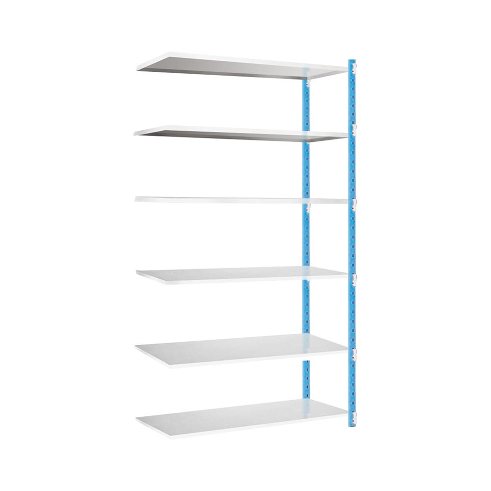 Étagère métallique 5 niveaux (Kit suivant) de dimensions H2000 x L1030 x P500 mm permettant une charge Maxi 250 KG par niveau. Le kit suivant pour étagère Tips est équipé de tablettes tubulaires. Il vous permettra de créer la configuration idéale de votre étagère métallique. Ajoutez un kit suivant pour augmenter vos capacités de stockage. Son montage se fait très facilement et rapidement, sans vis ni boulon, grâce à sa structure métallique très rigide qui ne nécessite pas de croisillons. Ses tablettes tubulaires vous permettront de stocker de petits conditionnements, jusqu'à 250 KG par tablette, et vous pourrez stocker jusqu’à 1200 KG par élément suivant en ajoutant des tablettes supplémentaires. L’étagère métallique et son kit suivant Tips sont garantis 2 ans.
